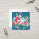 Monogrammed square business card in teal for an interior designer, event stylist, makeup artist or similar, featuring your initials in white atop a hand-drawn flower bouquet with pink roses, bright blue flowers, and a sprinkle of cherry blossom.