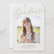 This elegant graduation photo card features calligraphy and a large photo. On the front, "Graduate" is written in pretty calligraphy script across the top, with a large photo below. At the bottom, you can add the graduate's name, school, and graduation year. The typography is gold against a light grey background. The back of the graduation card includes an optional template to add graduation party details.