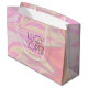 Elegant gift bag design featuring colourful faux holographic texture and elegant calligraphy font.