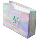 Elegant gift bag design featuring colorful faux holographic texture and elegant calligraphy font.