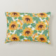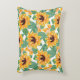 A pillow with a cute summery pattern. Pretty yellow sunflowers surrounded by green leaves in a repeating pattern.