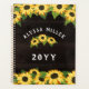 Pretty yellow sunflowers planner with your name in a curved text over sunflowers. The year in large rustic letters against printed wood grain.