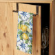 Bright, pretty Mediterranean tile print kitchen tea towel. Bright yellow, cobalt & light blue with lemons in the style of tile and linen art from Positano Italy. Practical gift for someone who loves Italian style pottery. (There is a matching 20 oz thermal mug and apron.)