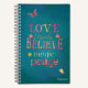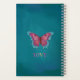 Pretty pink and bright colours beautiful journal. Perfect keepsake gift. With hand painted typography words "love, miracles, believe, magic, peace" with colourful butterflies, flowers and star. Easy to personalise name on front cover. On a blue green painted textured background with love and butterfly details on the back.