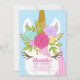 A white unicorn with pink hair and a gold-coloured horn, adorned with a mixture of flowers and leaves in shades of pink, purple, yellow, and green. Background is blue with a light foliage pattern. Personalise with your own details. You can add a photo on the back of the invitation using the Edit Tool. © Kimbellished, LLC