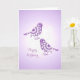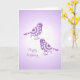 A very pretty Happy Birthday card with a vintage inspired illustration of elegantly patterned purple and white birds and flowers..