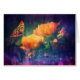 A beautiful orange butterfly lands on tangerine roses in full bloom, against a vibrant violet, purple and blue fantasy bokeh background shimmering with charm and lustre.