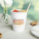 Pretty, modern, minimalist and trendy wedding paper cup features three colour watercolor brush stroke graphic with grey and coral coloured text blocks in modern fonts