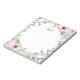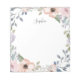 This trendy and elegant notepad features a wreath full of beautiful pink and peach watercolor roses and flowers, and lots of green and blue leaves and foliage on a white background.