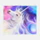 A pretty white unicorn with a fantasy background of blue, pink, and purple.