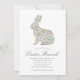 This beautiful Easter Brunch invitation features a hand drawn rabbit silhouette made up of wildflowers in dusty blue, golden yellow, dusty rose pink / mauve, and green. The back contains a matching floral design.