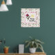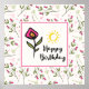 A sunny happy birthday poster with a square frame with a pink border which says "Happy Birthday" written in a trendy font with a yellow sun above and a pretty pink flower off to the side. The backdrop is a seamless pattern with hand drawn pink wildflowers with long green stems and leaves on a eggshell white coloured background. Pink circles and sprigs also decorate the design. Cute and summery design.