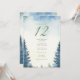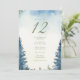 This table number card showcases a serene watercolor forest design with misty evergreens framing the card. The soft, calming blue and green tones blend seamlessly with the minimalist layout, creating an elegant yet rustic ambiance for any woodland or outdoor-themed event. The large table number is prominently displayed at the top, while the names of the guests are listed clearly below, making it easy for attendees to find their seats. Perfect for weddings or formal events that incorporate a natural, forest-inspired aesthetic.