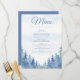 Woodland-inspired wedding menu card. The design features a serene blue and green watercolor forest landscape along the bottom, paired with classic blue script and serif fonts for a refined look. Perfect for rustic, outdoor, or nature-themed weddings, this menu card displays your courses and custom details in a clear, stylish layout. The soft pastel background and romantic pine tree border add a touch of tranquillity to each place setting, creating a memorable dining experience for your guests