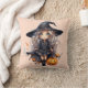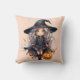 At its heart, the pillow features a pretty blonde-haired witch with striking blue eyes, dressed in a stylish all-black ensemble that includes a large, elegant witches hat. The witch is depicted with an endearing smile as she carries a glowing jack-o'-lantern, radiating warmth and charm.