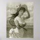 Beautiful woman with long hair in fancy white dress and hat holding flowers and tennis or badminton racket. Artist print from 1887.