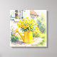 Floral artwork. A lovely illustration of yellow flowers in a yellow watering can sitting outside on the walkway on the side of the house. A pretty summer watercolor ai illustration.