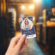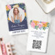 Beautiful floral employee badge with a pattern of flowers in pink and yellow. Your employee's photo in a round frame against the floral pattern background. Add name, title, and business name. On the back, additional text and your QR code.
