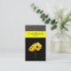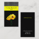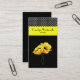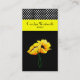 Stylish ladies business card, done in black, with lovely graphic artwork of two yellow poppies. A yellow bold stripe, above the poppies, and a black and white polka dot pattern, on the top of the card. The back is done in solid black. White, black, and yellow text is ready to personalise with your information. A lovely stand out card great for any kind of occupation or business.