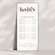 Showcase your eyelash extension services with this elegant and professional lash artist price list rack card. Designed for lash technicians, and beauty salon owners, this customisable service menu helps clients easily view pricing and available treatments. The stylish, minimalist design with soft pink and gold accents adds a luxurious touch to your brand, making it perfect for display at your salon, beauty spa, or lash studio. Keep your business organised and professional with this beautifully designed price list card.