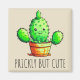 Illustration of a green, cute Kawaii cactus with smile and "Prickly but cute" text design