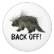 Features a porcupine and the warning "Back Off." A porcupine is any of 29 species of rodent from a number of families. Porcupines are indigenous to the Americas, southern Asia, and Africa. Porcupines are the third largest of the rodents, behind the capybara and the beaver. Most porcupines are about 25–36 in (63–91 cm) long, with an 8–10 in (20–25 cm) long tail. Weighing between 12–35 lb (5.4–16 kg), they are rounded, large and slow. Porcupines come in various shades of brown, grey, and the unusual white. Porcupines' spiny protection resembles that of the unrelated hedgehogs and echidnas. The name porcupine comes from Middle French porc espin (spined pig) A regional American name for the animal is quill pig. The North American porcupine, Erethizon dorsatum, has the northernmost range of all the world's porcupines. Evidence indicates that they have only been a part of North American fauna sincemillion they immigrated north from South America some three million years ago. Porcupines are 25 to 31 inches long covered with hair and quills of varying length, except on the foot pads and nose. The tips of the long guard hairs are lighter and give the coat hues of yellow or white. The hair and a thick layer of body fat helps keep the porcupine warm during the winter. The tail is extremely muscular and adapted to aid in climbing and defence. The upper surface of the tail is heavily covered with quills, while the underside is covered in bristle-like hairs used to aid in climbing. The quilled pelage of the porcupine makes it unique among North American mammals. Quills cover the body, except on the legs and belly. The quills are modified hairs which have microscopic barbs on the tips and are filled with a spongy matrix. Quills from different parts of the body vary in length, flexibility, colour, shaft diameter, and barb length. The average weight of an adult male porcupine ranges from 15 to 18 pounds, but some individuals can weigh up to 30 pounds. Adult females weigh about 2-4 pounds less than males. Porcupine have excellent senses of smell, hearing, and taste, but relatively poor eyesight. Porcupines make a wide variety of sounds ranging from whimpers to screams, depending upon the circumstance. Breeding takes place in the fall months from late September to early November. Males seeking receptive females expand their home ranges up to five times the normal size. If more than one male shows interest in the same female, they will fight for the opportunity to mate with the female. Males use their incisor teeth and quills when fighting, and usually it is the largest and heaviest male which wins dominance. The breeding male then splashes the female with urine. If she is not ready to mate, she shakes off the urine and leaves. If she is ready, she stays and the male mounts in the traditional posture with the female in front and the male in the rear. She will curl her tail over her back, covering most of the quills. Males reach maturity at 24 months and females at 12 months. After a gestation period of about 210 days, only a single young is born. The gestation period is extremely long for a rodent, twice the time for a beaver. At birth the young weighs between 1 and 2 pounds and is about 10 inches long. Its eyes are open and its body covered with long grayish-black hairs and quills. Within a matter of hours the quills dry and serve as protection. The young porcupine is then capable of following its mother, although the young will not be able to climb large trees for several weeks. The young are able to eat some vegetation after a few weeks, but the female continues nursing the young for 3.5 months. During the summer the young stay close to their mothers, learning about den sites and food trees, but towards the end of summer they start to spend more time apart. By October, when the female mates again, the young are fully weaned and wander off to face the winter alone. Porcupines utilise natural cavities, such as rock caves, hollow logs and trees, or even the thicker vegetation in a tree as dens. In areas without snowfall, dens are not used so much. Porcupines stay active throughout the winter. Porcupines are primarily arboreal, and spend most of their time in the winter feeding in trees. While powerful climbers, porcupines do occasionally fall from trees. Thirty percent of the animals examined in one study showed evidence of healed fractures indicating that they had fallen out of trees. When climbing, the porcupine uses the stiff bristles on the undersurface of the tail as support. The animal has long, curved front claws which also aid in climbing. The inner bark (phloem and cambium layers) of spruce, birch and hemlock and spruce needles are the major winter foods for porcupine living in Alaska. In the spring and summer, buds and young green leaves of birch, aspen, cottonwood and willow are eaten until the tannin levels build too high for the porcupine to tolerate. Because they are vegetarians and most vegetable matter is very low in sodium, porcupines need additional sodium in the blood to balance cell potassium levels. As a result, porcupines seek out salt sources such as natural licks, glue which bonds plywood together, human perspiration on tools, road salt, and some paints. Porcupines also feed on shed antlers and the bones of dead animals to obtain sodium and calcium. Most carnivores would not pass up a meal of porcupine. However, an encounter between a young inexperienced predator and a porcupine can be a very painful experience. Some unfortunate carnivores have starved to death because a mouthful of quills has prevented them from eating. In an effort to remove the quills, the predator can cause the barbed quills to work into the deep tissues. Predators have different means of killing and eating porcupines. In the Northeast United States, the fisher has learned to specialise on a diet of porcupine. The fisher circles around the porcupine until it can bite its nose. After repeated bites to 