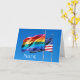 A bright note card featuring a billowing rainbow Pride flag along with an American flag, set against a brilliant blue sky. Celebrating a welcoming, diverse America. Photographed at Cherry Grove on Fire Island. Part of the Pride Collection.
