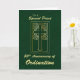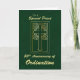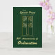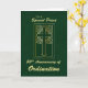 Elegant is design, this 50th Ordination Anniversary card for a priest has gold coloured words and a cross with host behind it in a gold look. The background is a leather look in dark green. Beautiful card to wish a priest congratulations and blessings on his 50th anniversary!