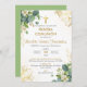 Invite loved ones to celebrate your child’s First Communion with this invitation, featuring green leaves and golden flowers. Perfect for both boys and girls, it’s an ideal choice for a Catholic Holy Communion.