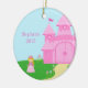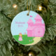 This circle shaped ceramic ornament has a sweet princess theme. There is a cute little princess with blonde hair standing to the left of her hot pink castle that is on the right. On the ground, there is lots of blue and pink flowers. At the left, you can customise the name and the year.