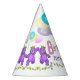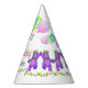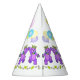 Top off your girl's 1st birthday party with these fun party hats featuring cute purple princess teddy bear with a golden crown, party balloons, dainty pink an yellow flowers and the party girl’s name. Personalise name in the template provided.
