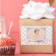 Vintage baby girl in a crown and a diamond necklace. Blush pink frame embellished with pearls & diamonds on a diamond tufted background. Blush pink banner for your text.