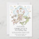 A magical watercolor castle kingdom with princess and dragon, girl's 1st birthday party invitation with a white border. Whimsical, magical and cute, for a young child.