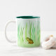 This mug features small female green frogs with yellow bellies sitting among the grasses at the pond. They seem lonely as if waiting for Prince Charming to appear.