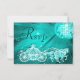Womens' personalised, elegant custom RSVP cards. Beautiful teal double sided woman's rsvp cards with a funky retro disco mirror ball and glamourous printed image rhinestone glitter, sequins bling jewels sparkle royal Princess carriage / coach with crown / tiara and horses on a vibrant teal turquoise blue and white lights and sparkles background. There is a beautiful music musical note and high heels stiletto shoe / fairytale glass slipper on the reverse of the cards. Magical, chic, classy, cute, girly, modern rsvp's with trendy, fashionable colours. These groovy, stylish, sophisticated, pretty birthday rsvp cards are decorated / printed on both sides. Perfect rsvp cards for a dinner dance dancing event or any lavish, luxury affair. PLEASE NOTE: All products on Zazzle have flat printed images. If you need any assistance customising your product please contact me through my store and I will be happy to help.
