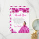 This sweet sixteen thank you card features a beautiful princess in a hot pink ball gown with floral arrangements. This is perfect for a sweet sixteen birthday party.