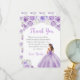 This Quinceanera thank you card features a beautiful princess in a dusty purple ball gown with floral arrangements. This is perfect for a Quinceanera birthday party.
