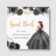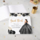 This sweet sixteen guest book features a beautiful princess in a black ball gown with floral arrangements. This is perfect for a sweet sixteen birthday party.