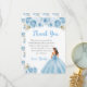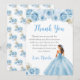 This Quinceanera thank you card features a beautiful princess in a blue ball gown with floral arrangements. This is perfect for a Quinceanera birthday party.