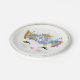 Sweet birthday or baby shower paper plate done in white, with graphics of a gold thin rim around the outer edge. Graphics of an adorable kitty face with pink heart shaped nose, big eye lashes, gold glitter looking ears and crown, with blue flowers, decorates the centre of the plate. Customise to add any text you want. Matching products are available.