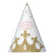 Personalised birthday party hat for a princess party that looks like you're wearing a gold crown with the birthday girl's age and name custom printed at the top of the hat.