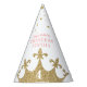 Personalised birthday party hat for a princess party that looks like you're wearing a gold crown with the birthday girl's age and name custom printed at the top of the hat.