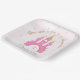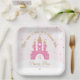 Personalised princess birthday party plates. A pink and gold princess castle with "Once upon a time, in a faraway land..." and then the Princess's name and how old she's turning printed below. Note: Gold elements will print to look like glitter gold, but no actual glitter will be used in the final product.