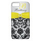 This modern, personalised, black and silver grey damask Barely There™ iPhone 7 case with a yellow PRINTED ribbon and PRINTED jewel brooch on it, has a spot for you to add your name and monogram. ***PLEASE make sure that your initial and name are centred where you want them, as it will as it appears on your monitor. If you need assistance personalising this case, email niteowlstudio@gmail.com.