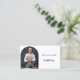 A classic white background.   Personalise and add your title, business name/name and text on front. Black text.  An arch shaped photo frame.