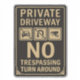 Protect your private property and deter unwanted visitors with this clear and authoritative "Private Driveway No Trespassing Turn Around" sign. Featuring a bold black and beige design with icons indicating no unauthorised vehicles, no U-turns, and 24-hour surveillance, this sign effectively communicates your property rules. The elegant decorative flourishes add a touch of sophistication while maintaining a strong warning. Ideal for residential driveways, private roads, or any area where you need to clearly define boundaries and enforce security.