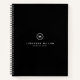 Modern notebook features a minimal design in a classic black and white colour palette. Custom name presented in the centre in stylish simple font with a complimentary minimal monogram medallion.