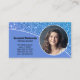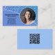 This professional card features an abstract blue and faux blue glitter background with all text on the front. The back features the matching front colour and QR code placeholder. Use the QR code link to send clients to a website, photos, reviews or other special location. Personalise the text fields, remove text or edit using the design tool to select a font style, size, and colour you prefer. Replace the photo with yours. A square photo works best. Placeholder photo courtesy pixabay.com. You can also add this design to the business card magnet or one of the other products, where it fits appropriately, shown in the TRANSFER scroll bar on this page.