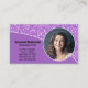 This professional card features an abstract purple and faux purple glitter background with all text on the front. The back features the matching front colour and QR code placeholder. Use the QR code link to send clients to a website, photos, reviews or other special location. Personalise the text fields, remove text or edit using the design tool to select a font style, size, and colour you prefer. Replace the photo with yours. A square photo works best. Placeholder photo courtesy pixabay.com. You can also add this design to the business card magnet or one of the other products, where it fits appropriately, shown in the TRANSFER scroll bar on this page.