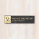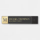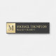 Professional Elegant Black and Gold Door Sign featuring black monogram on gold side border, with name and profession in gold serif font style, on black background.